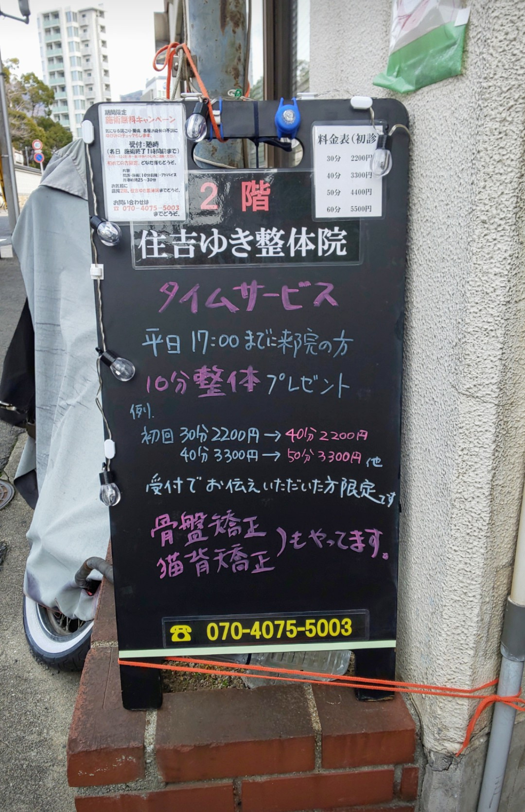 東灘区の住吉ゆき整体院は平日タイムサービスを始めました 2020/01/16 住吉ゆき整体院ではキャンペーンを始めました。 平日17:00までに来院の方には 入口の看板を見た方限定で 「10分整体」をプレゼントさせていただきます。 受付で申し付けください。 この「10分整体」で施術のグレードが上げられます。 コンセプト メニュー