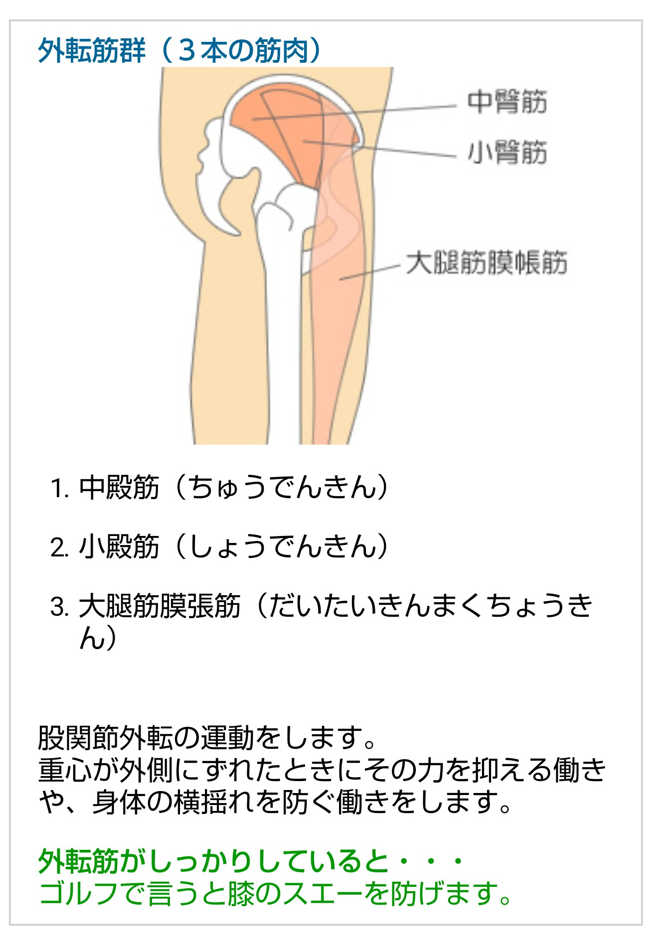 股関節に関わる筋肉ー臀筋編 2020/02/17 股関節は重要です。 今回はおしりの上についている筋肉、臀筋についてお話します。 ここの筋肉は股関節を外転、横に上げる動きをします。 腸腰筋ほどではありませんが腰痛にも影響します。 骨盤の開きにも関係あります。 あまり馴染みのない筋肉ですが、大腿筋膜張筋は二関節筋で骨盤から膝にかけてついている筋肉です。 正確には骨盤の上前腸骨棘から脛骨外側顆にかけてついています。膝に近いところは腸脛靭帯です。 ランナー膝ともいわれる腸脛靭帯炎ですが、これは、繰返しの膝の曲げ伸ばしにより膝の外側が擦れて炎症をおこす現象です。 筋肉が硬すぎたり、捻れがあったりするとなりやすくなります。 筋肉が硬すぎるのも困りますが、ここの筋肉の筋力が少ないと、しっかり踏ん張って立てませんし、姿勢の維持もできません。もちろん、長時間歩けなくなります。 サービス メニュー