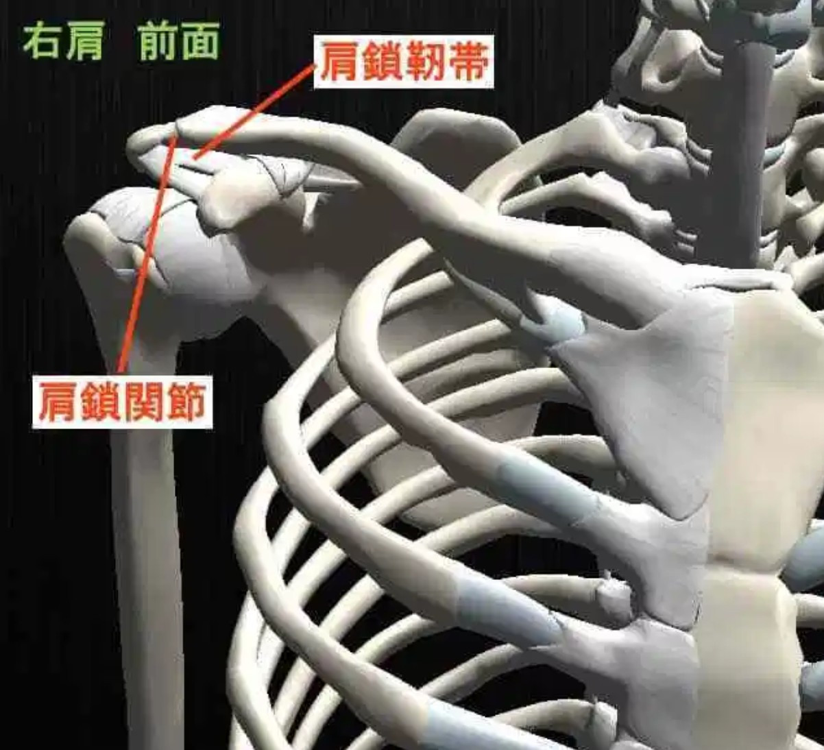 「肩甲上腕関節」や「肩甲胸郭関節」は大きく動く関節ではありますが、地味な「肩鎖関節」やここには出していませんが、体の正面肋骨の前の胸骨と鎖骨をつなぐ「胸鎖関節」の動きに左右されています。