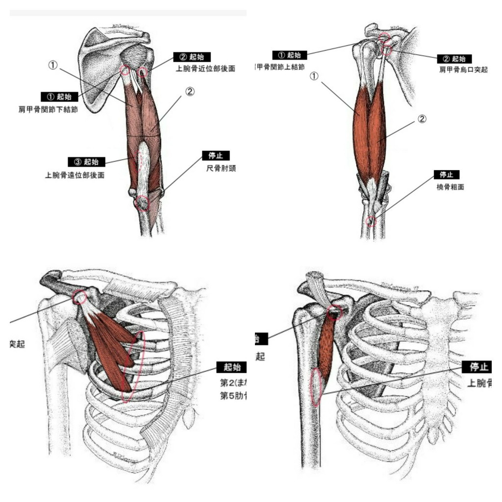 左上から時計回りに【上腕三頭筋、上腕二頭筋、烏口腕筋、小胸筋】