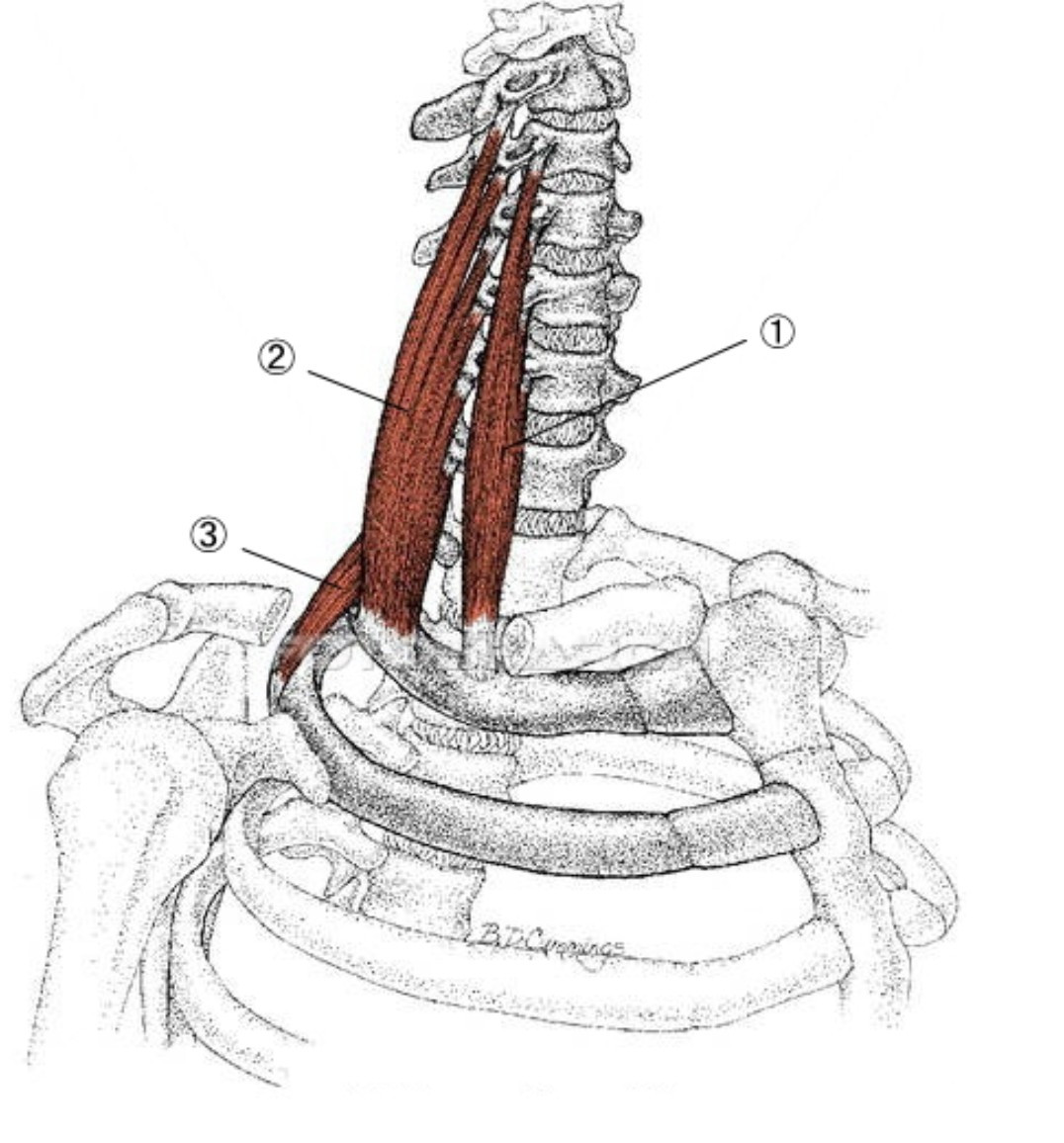 斜角筋は肋骨上部と繋がっておりその部位を広げる事によってスムーズな胸式呼吸を可能にしています。