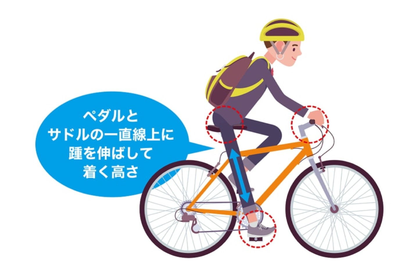 ①サドルはペダル(下になった状態)に足の拇趾球を乗せた状態で軽く膝が曲がった状態にする