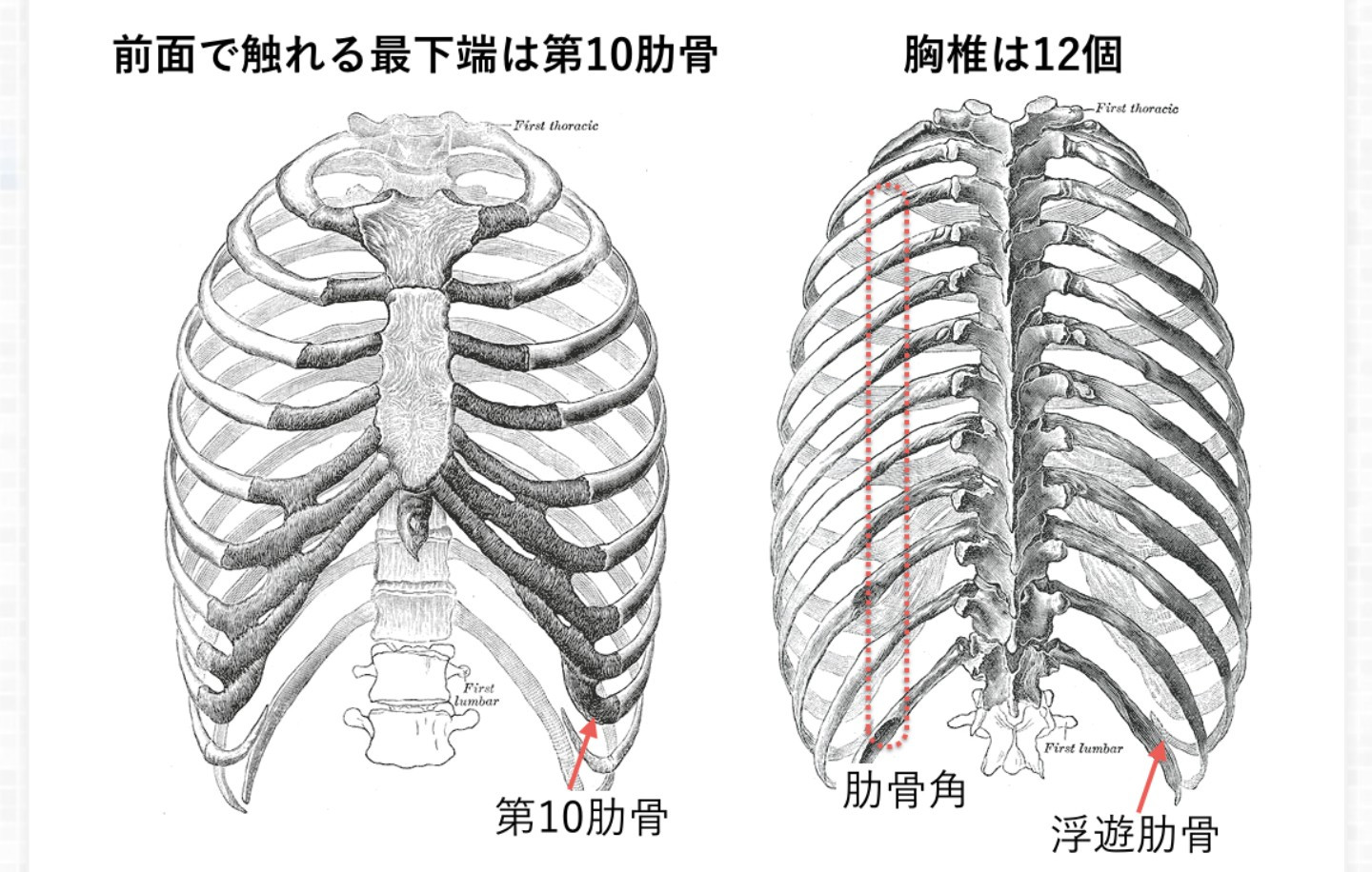 胸椎の下の2つ(T11,12(Tは胸椎の略))の肋骨は胸骨にはついていません(そのため、骨折はしにくいです)。