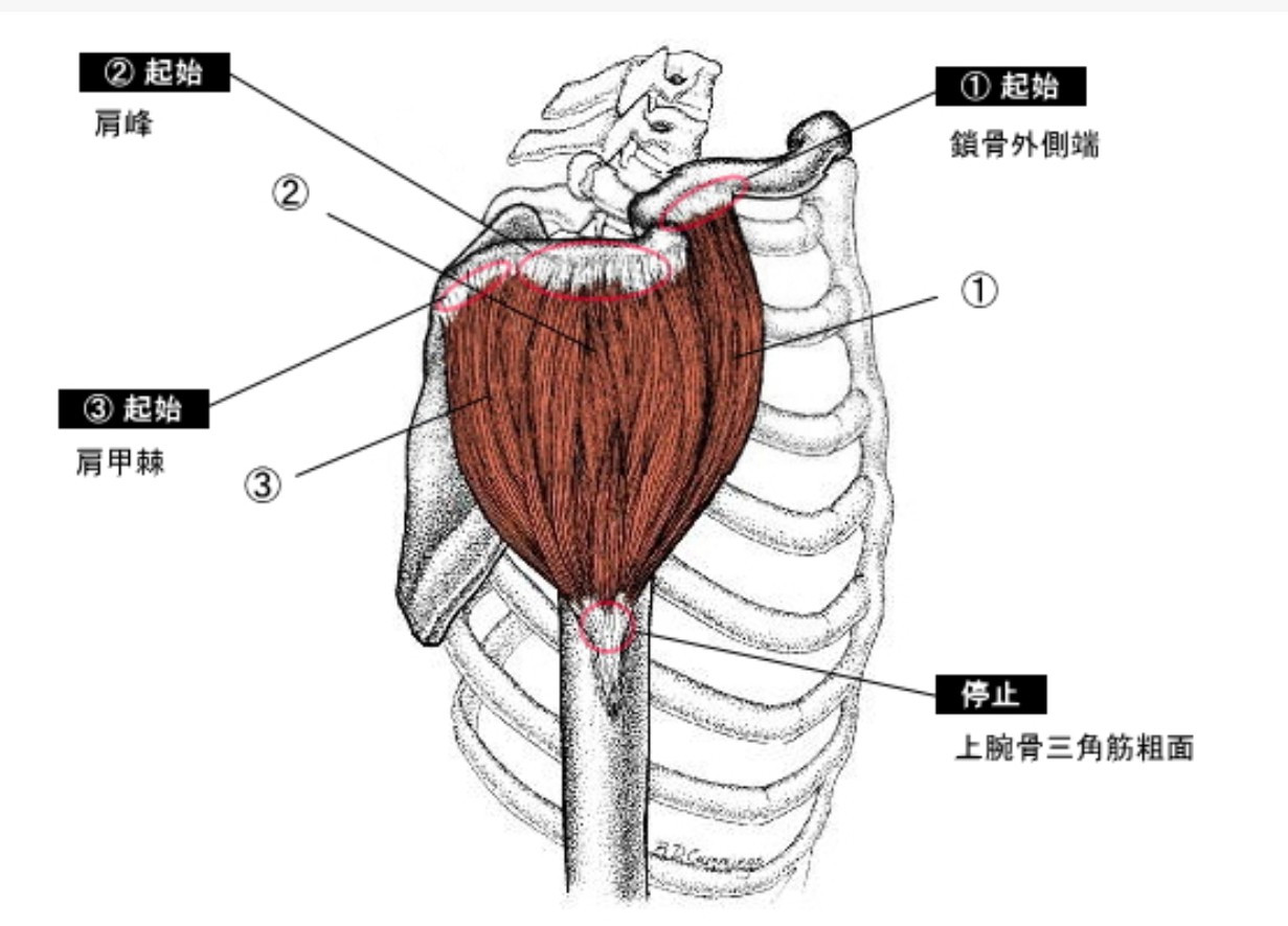 三角筋が表面、その奥に棘上筋をはじめとして肩甲骨についている筋肉があります。