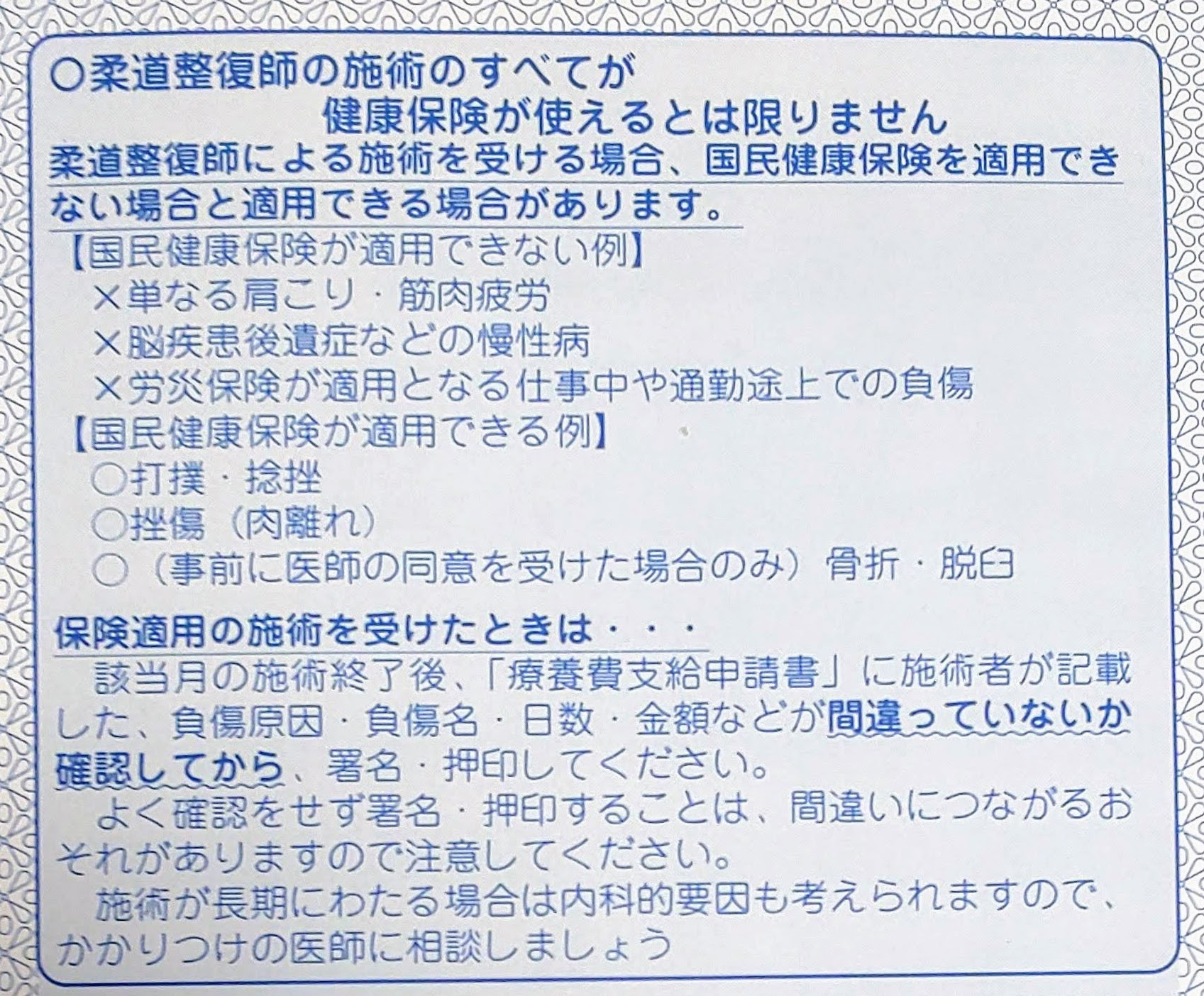 これは、整骨院では健康保険の適用範囲かどうか、ということできっちり聞きます。